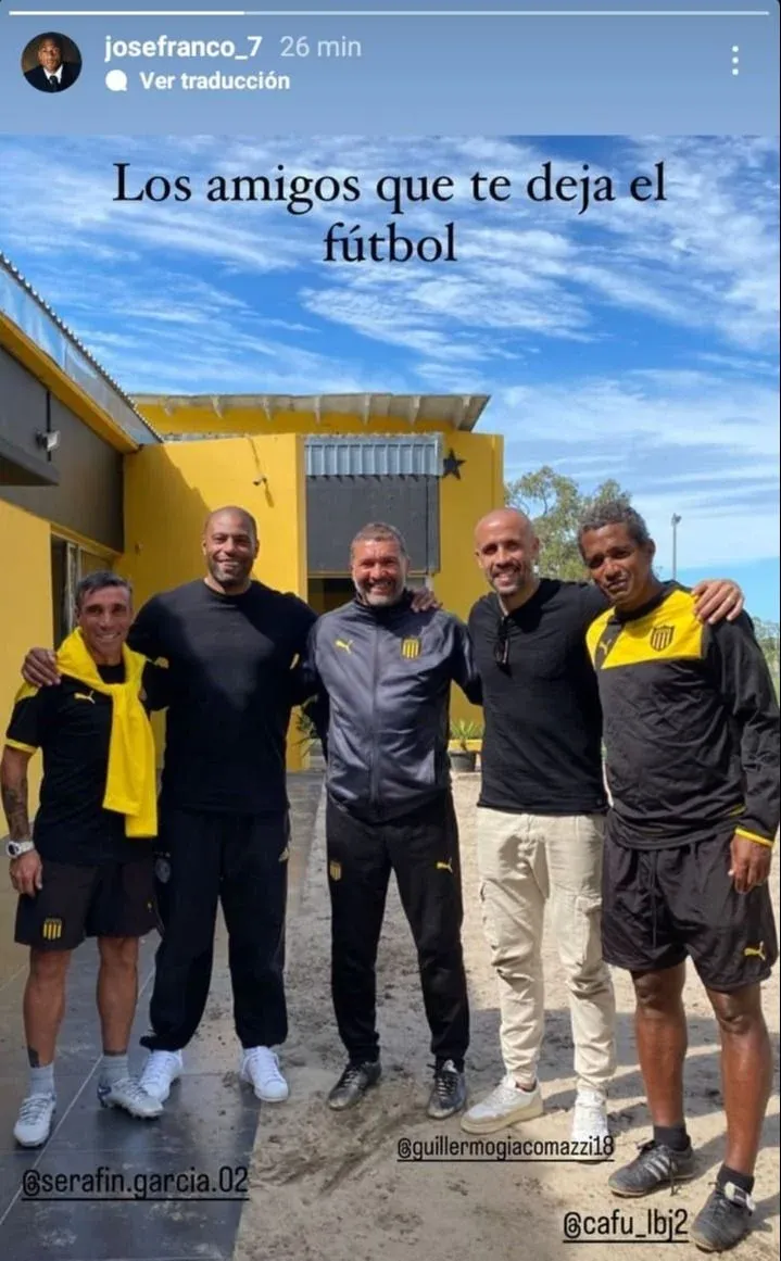 “Hoy recibimos la visita de dos amigos que nos dejó el futbol, campeones con Peñarol @JoseFranco2809 y Guillermo Giacomazzi. Acá con Serafín García y @BarbosaFuringa2. Una alegría enorme volver a verlos. Peñarol, Peñarol!!!”, escribió en sus redes “el Caballo” De los Santos.