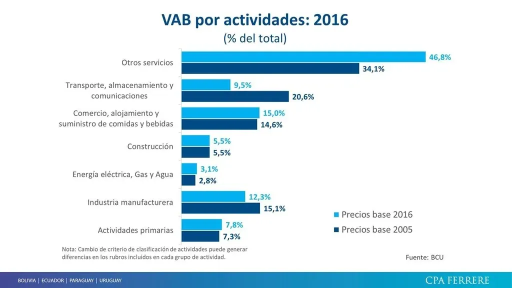 La consultora CPA Ferrere explicó que el cambio en el año base repercute en el peso de sectores sobre valor agregado total. Para 2016, se destaca el aumento de la ponderación en otros servicios y la fuerte caída en transporte, almacenamiento y comunicaciones.