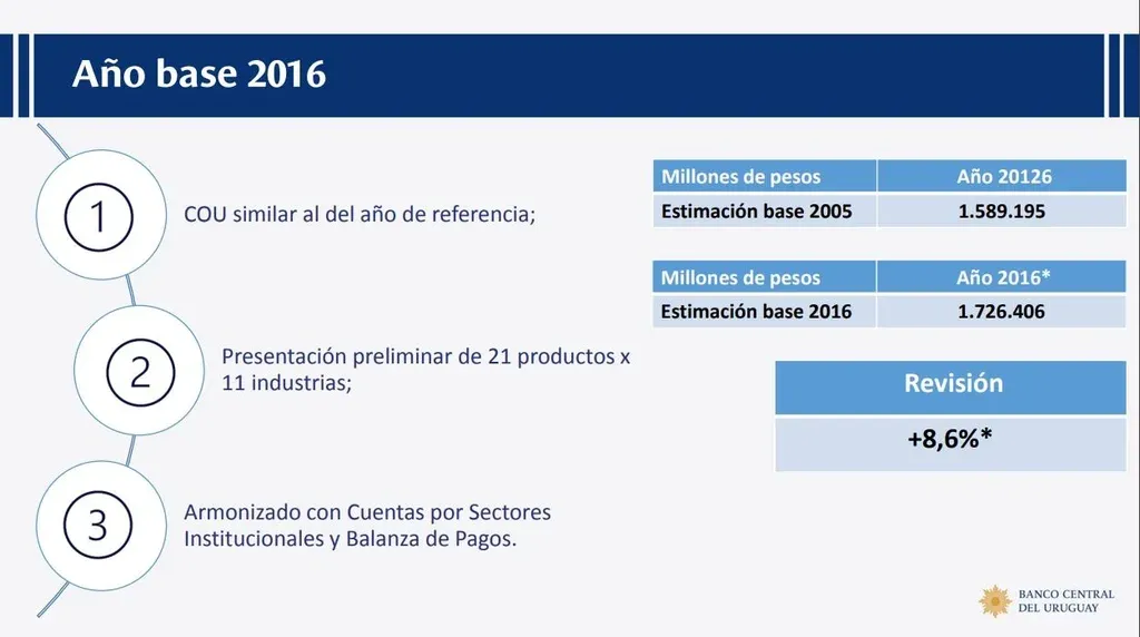 El Banco Central del Uruguay (BCU) presentó este jueves la actualización de Cuentas Nacionales e Internacionales. Según la nueva metodología utilizada, el Producto Bruto Interno (PIB) en 2012 (año de referencia) fue un 8% mayor a lo que se había estimado hasta ahora. En tanto, que para 2016 (nuevo año base) el PIB nominal fue revisado un 8,6% al alza.
