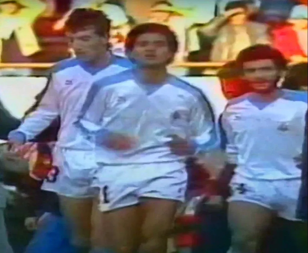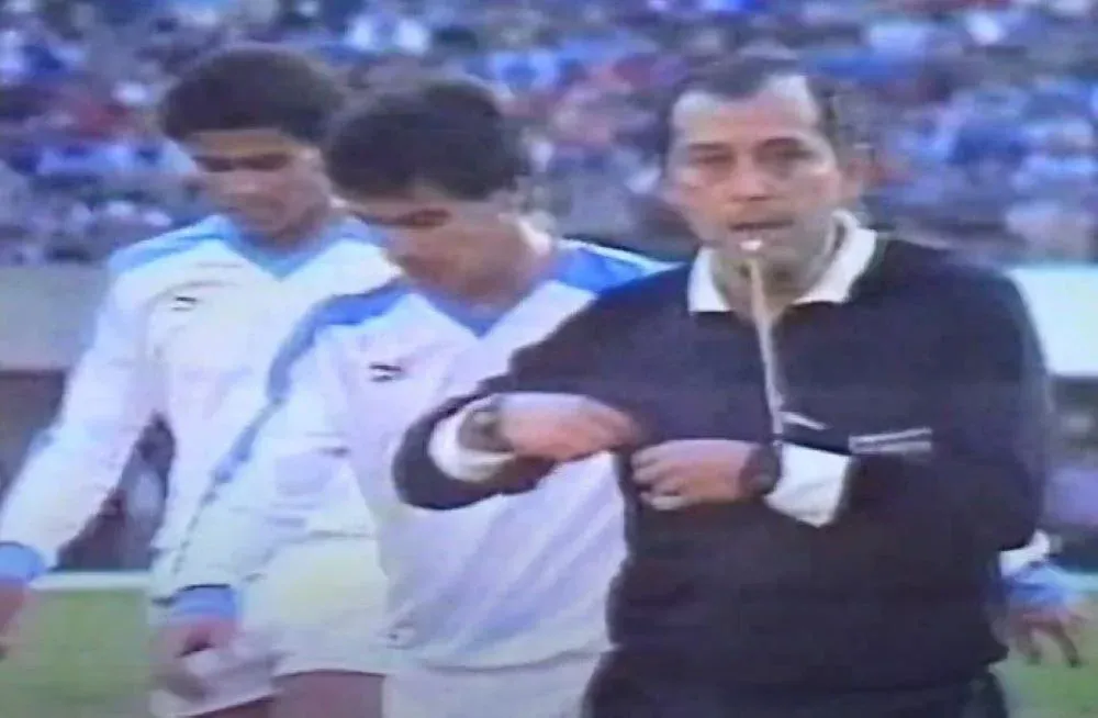 En una acción del partido entre Uruguay y Argentina por la Copa América de 1987, aparecen el árbitro Jácome de Ecuador, Pablo Bengoechea y Eduardo Da Silva