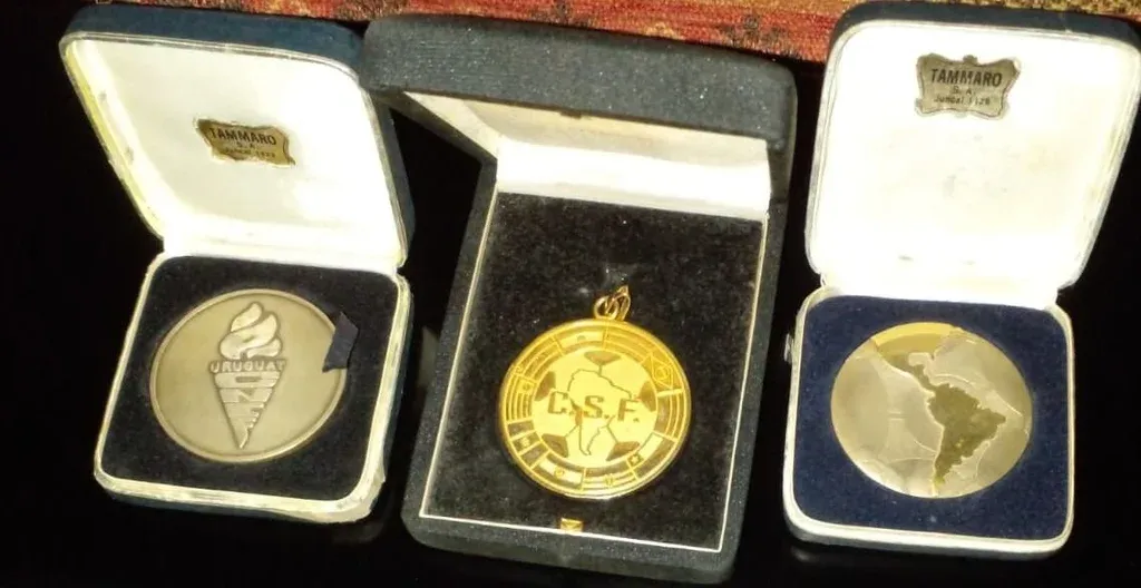 Las tres medallas que guarda Eduardo Da Silva como un tesoro; la del medio fue entregada por la Conmebol por ganar la Copa América 1987, en tanto que las otras dos, se las entregó la AUF