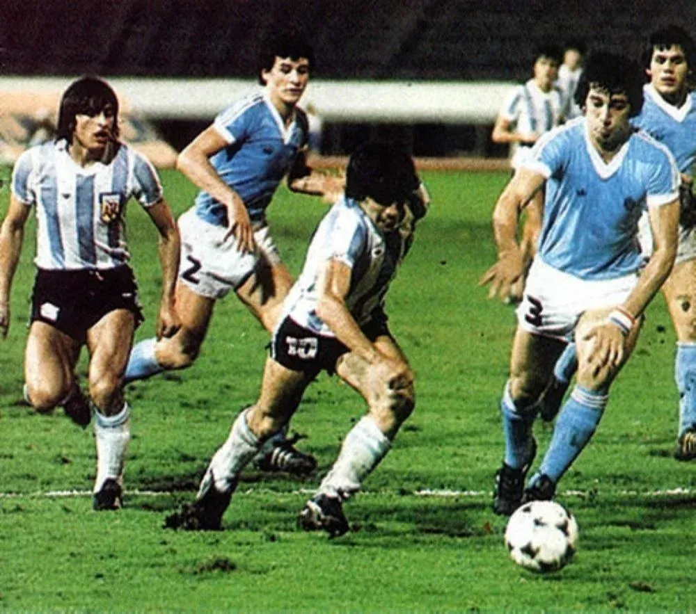 Domingo Cáceres aparece detrás de Diego Maradona, mientras Nelson Alagüich va a la marca en el partido Uruguay y Argentina del Mundial juvenil de Japón 1979