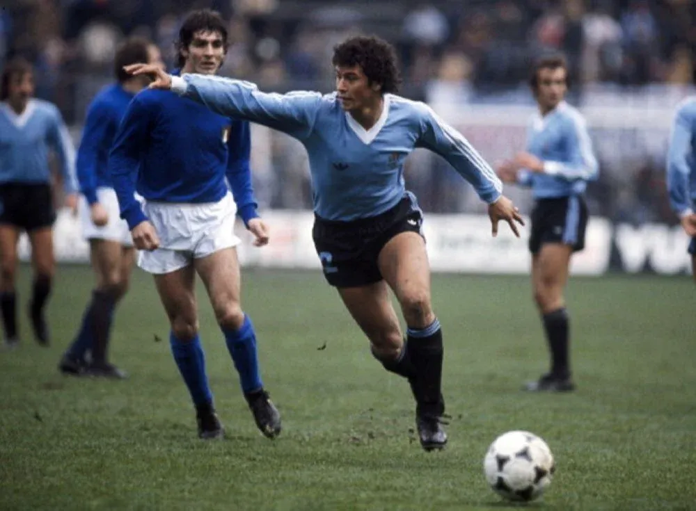 Domingo Cáceres ordenando la defensa de la selección uruguaya mayor, enfrentando a Italia; detrás aparece Paolo Rossi, quien sería goleador del Mundial 82