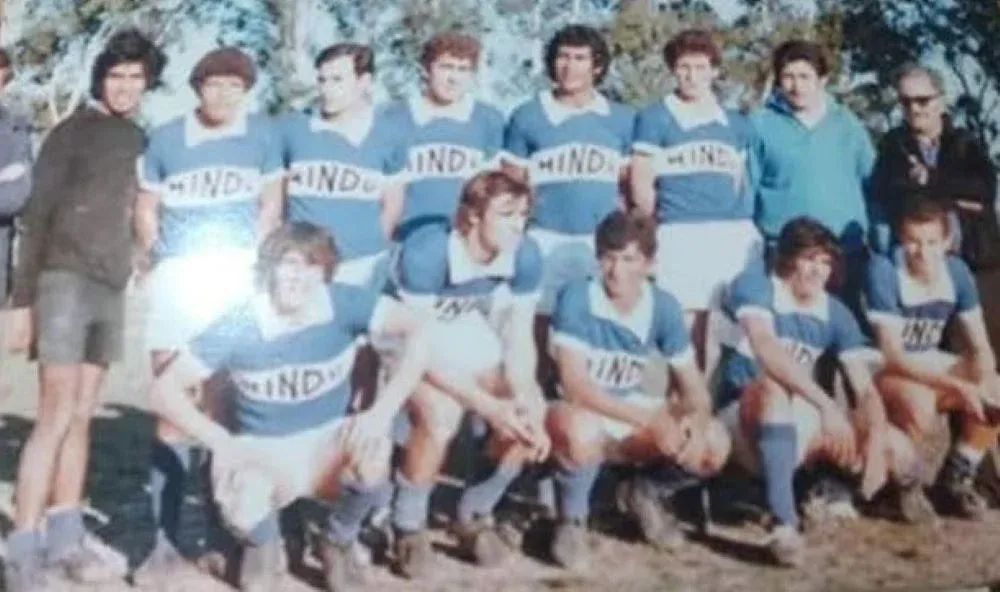 El equipo de Hindú de Salto en el que comenzó Domingo Cáceres; en la foto, aparece arriba a la derecha, al lado del técnico vestido de celeste; entre los de abajo desde la izquierda, el segundo es Luis Cavani, el padre de Edinson