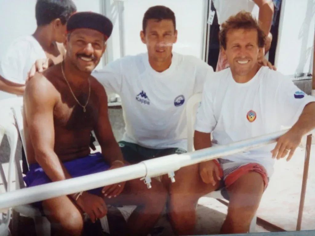 Wilmar Cabrera junto a Júnior y Zico, dos estrellas brasileñas, previo a un partido de fútbol playa entre Uruguay y Brasil