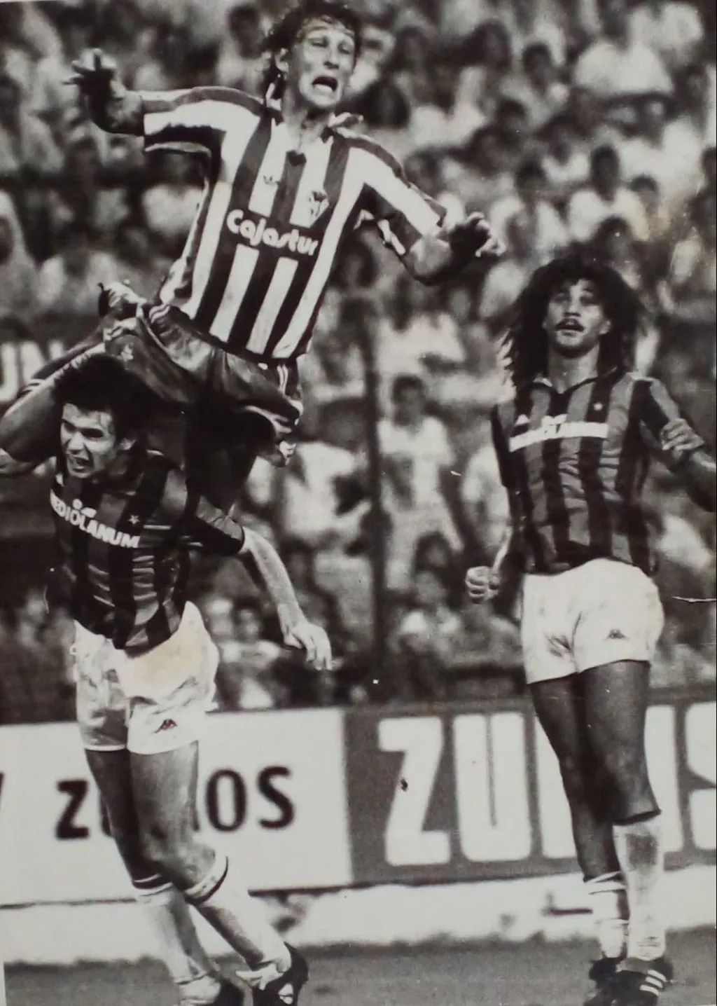 Tremendo salto de Wilmar Cabrera, típico de su estilo de juego aéreo en el partido entre Sporting Gijón de España y Milan por la Copa UEFA 1987; atrás aparece el holandés Ruud Gullit