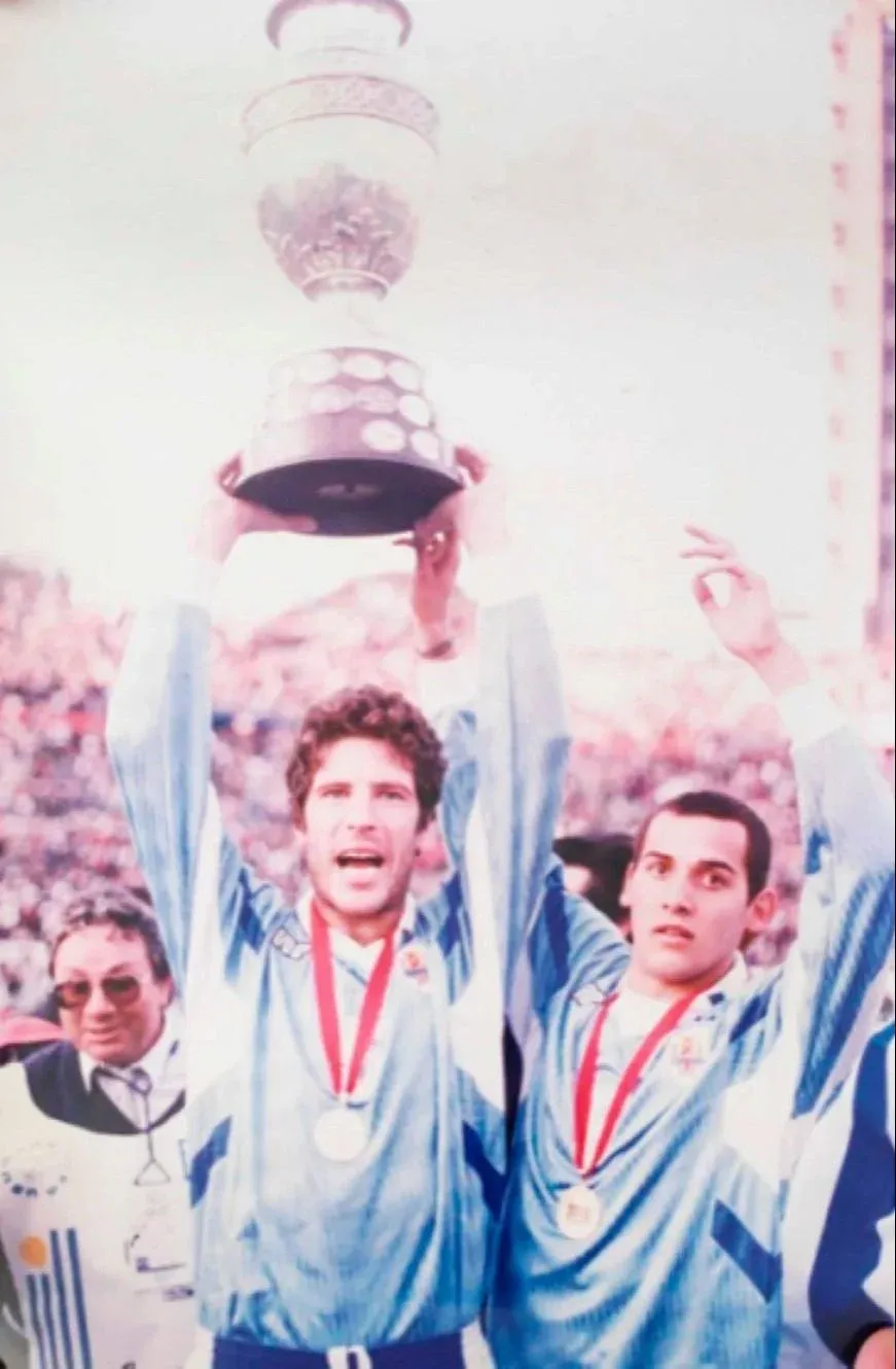 Álvaro Gutiérrez levanta la Copa América ganada por Uruguay en 1995 y junto a él, aparece Edgardo Adinolfi