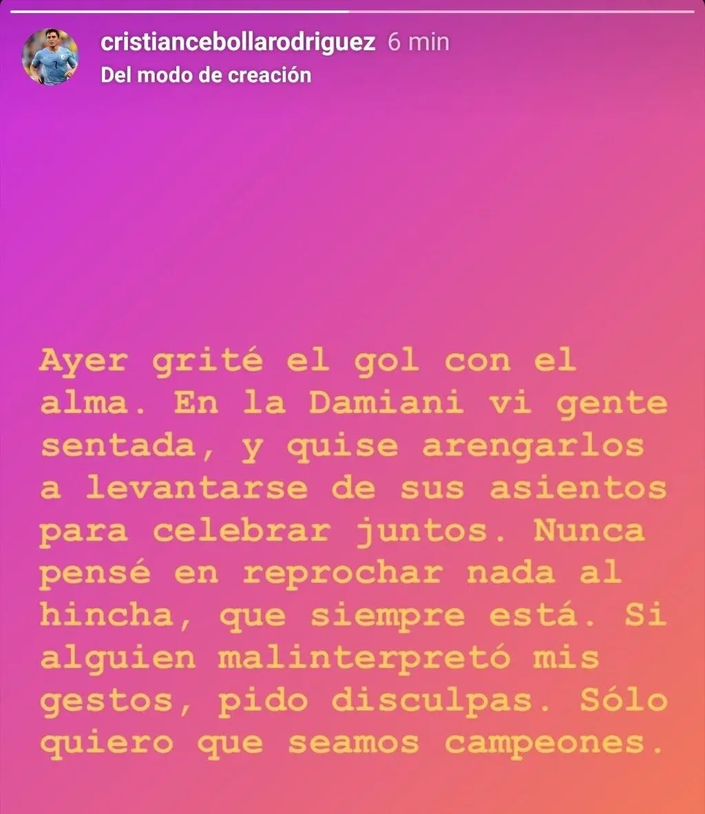 "Ayer (el sábado) grité el gol con el alma. En la Damiani vi gente sentada, y quise arengarlos a levantarse de sus asientos para celebrar juntos. Nunca pensé en reprochar nada al hincha, que siempre está. Si alguien malinterpretó mis gestos, pido disculpas. Solo quiero que seamos campeones", escribió el capitán mirasol.