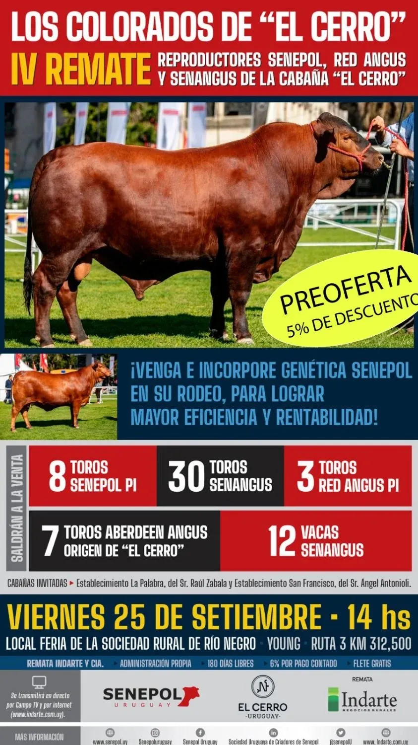 Este viernes 25 de setiembre, desde la hora 14, se desarrollarán las actividades del IV remate de "Los colorados de El Cerro", a cargo de la firma Indarte & Cía.