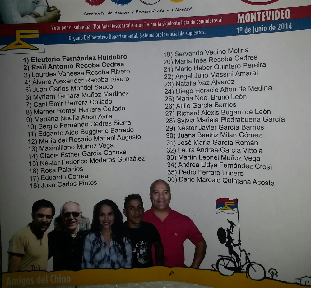 “Amigos del Chino”, así se llama la agrupación de la lista 97373, que registró su lista de candidatos al órgano deliberativo departamental en Montevideo para participar en las internas del domingo 1º de junio. El futbolista del Club Nacional, Álvaro Recoba, aparece en el cuarto lugar de la lista, abajo del líder de la Corriente de Acción y Pensamiento – Libertad (CAP-L) y ministro de Defensa Nacional, Eleuterio Fernández Huidobro.