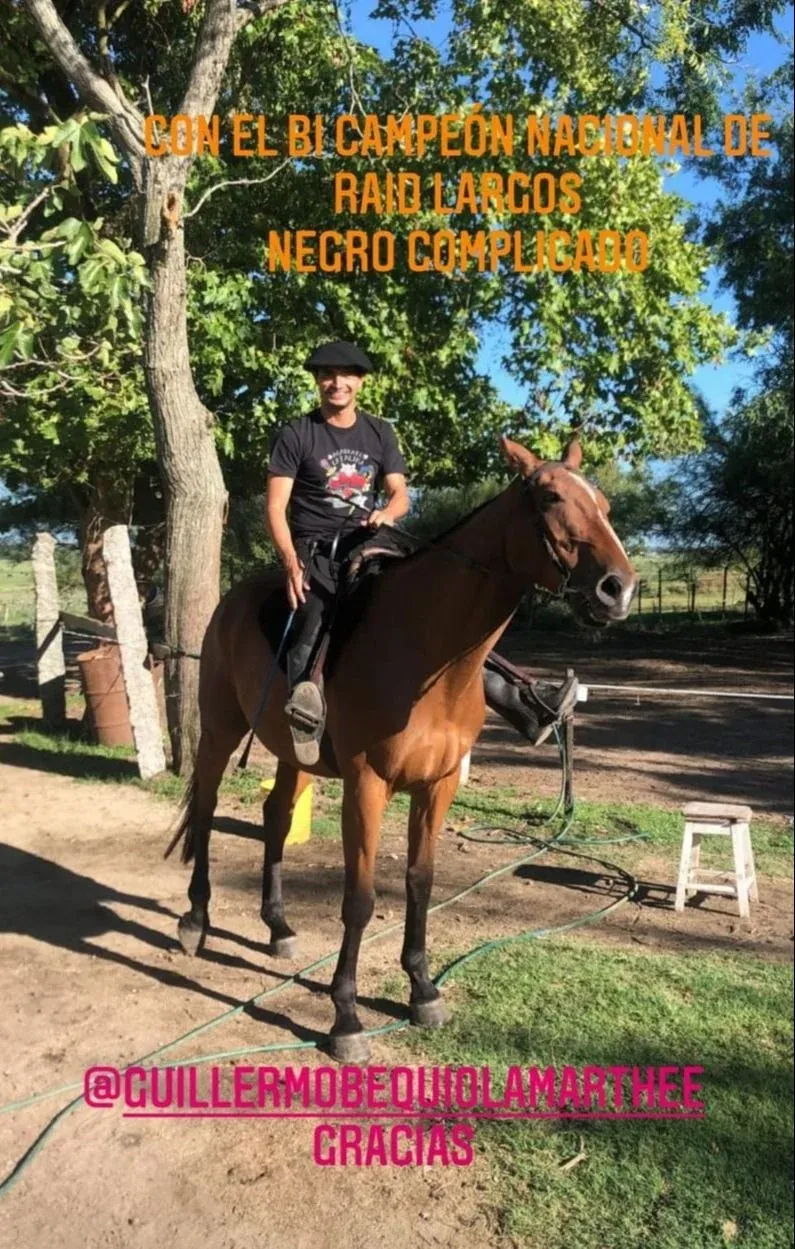 “Con el campeón nacional de raid largos: ‘Negro Complicado’”, escribió el pasado viernes en una foto en la que se lo ve de botas y boina sobre el mencionado caballo.