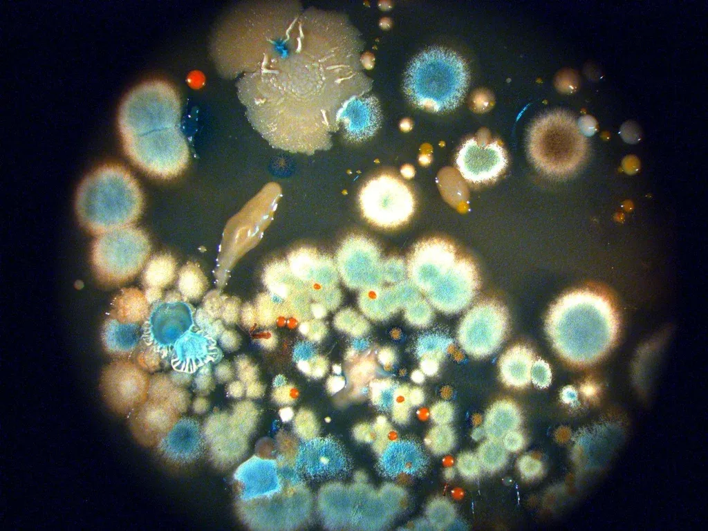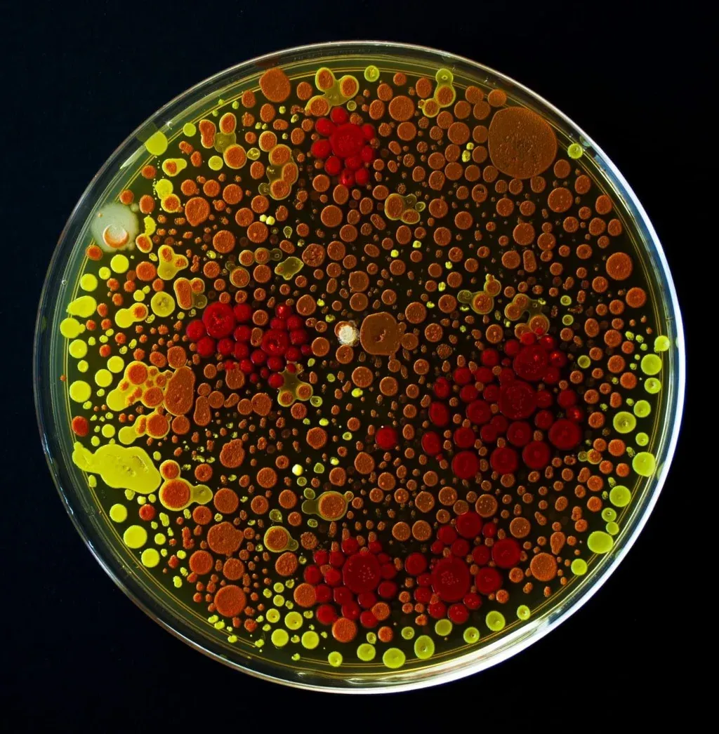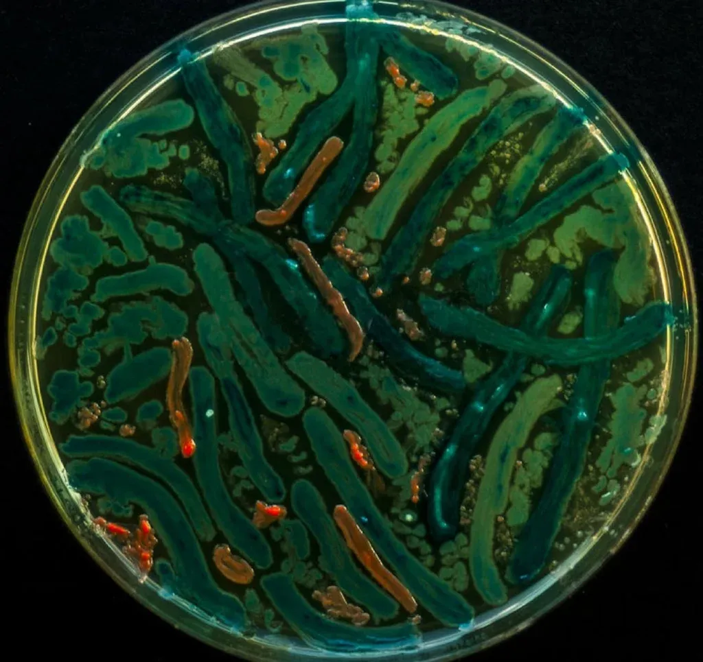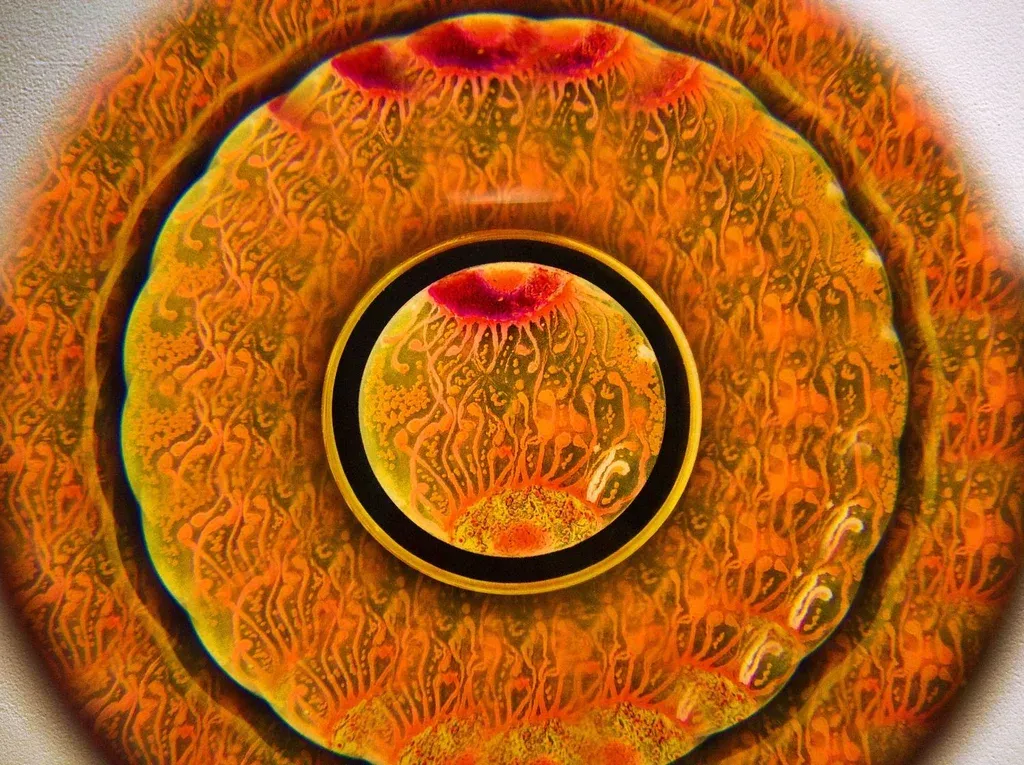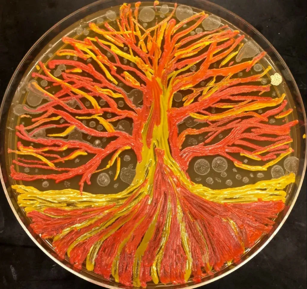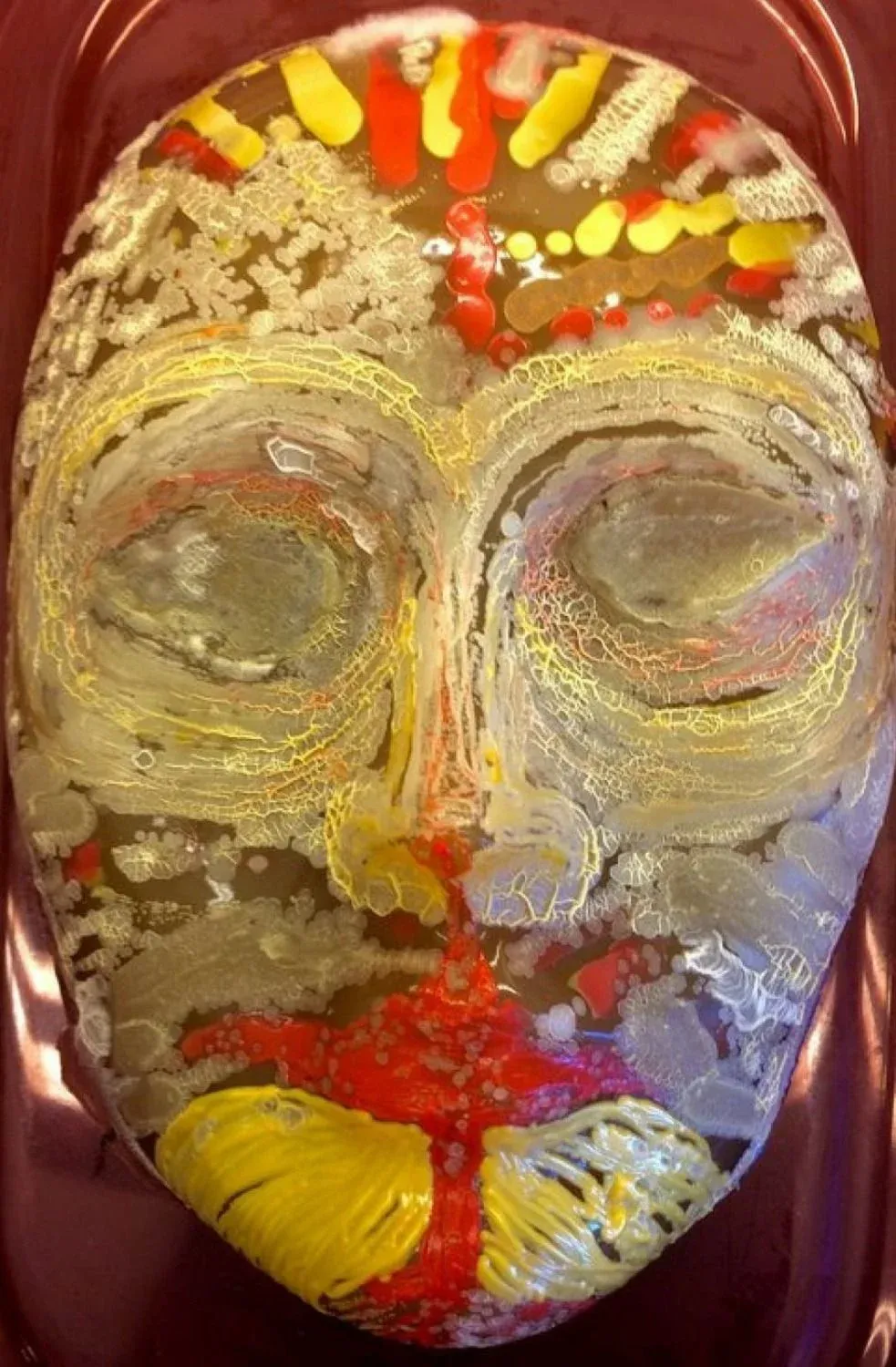 Bacterial Art Las obras –llamadas petris– se hacen en unos pequeños recipientes circulares de plástico transparente que se rellenan con agar, un producto de textura gelatinosa, color amarillento y sabor salado. Sobre ese pequeño ecosistema los artistas “pintan” con bacterias. Utilizando espátulas de distintos grosores van haciendo formas y dibujos esparciendo una sustancia de diferentes colores cargada de microbios –inofensivos para los humanos– que crecen y se desarrollan sobre el lienzo.