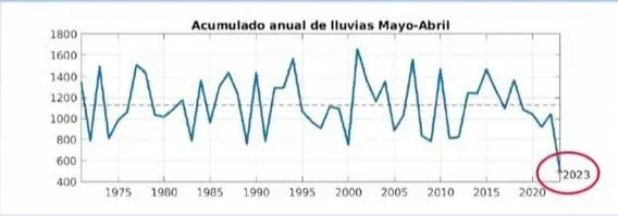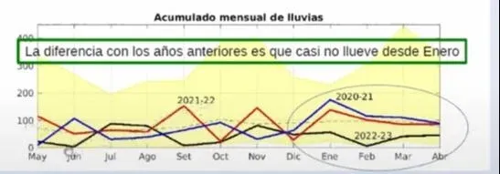 Entre mayo 2022 y abril 2023 llovió 500 milímetros, menos de la mitad (43%) de lo que llueve en un año promedio. “Está muy por debajo del promedio historico y muy por debajo de las sequías típicas de la región de los últimos 50 y pico de años”, explicó Barreiro.