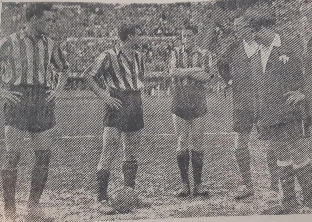Juan Eduardo Hohberg, Omar Míguez y Juan Alberto Schiaffino esperan junto al árbitro Horacio Bochetti y el línea Pedro Obregón la salida de Nacional para el segundo tiempo