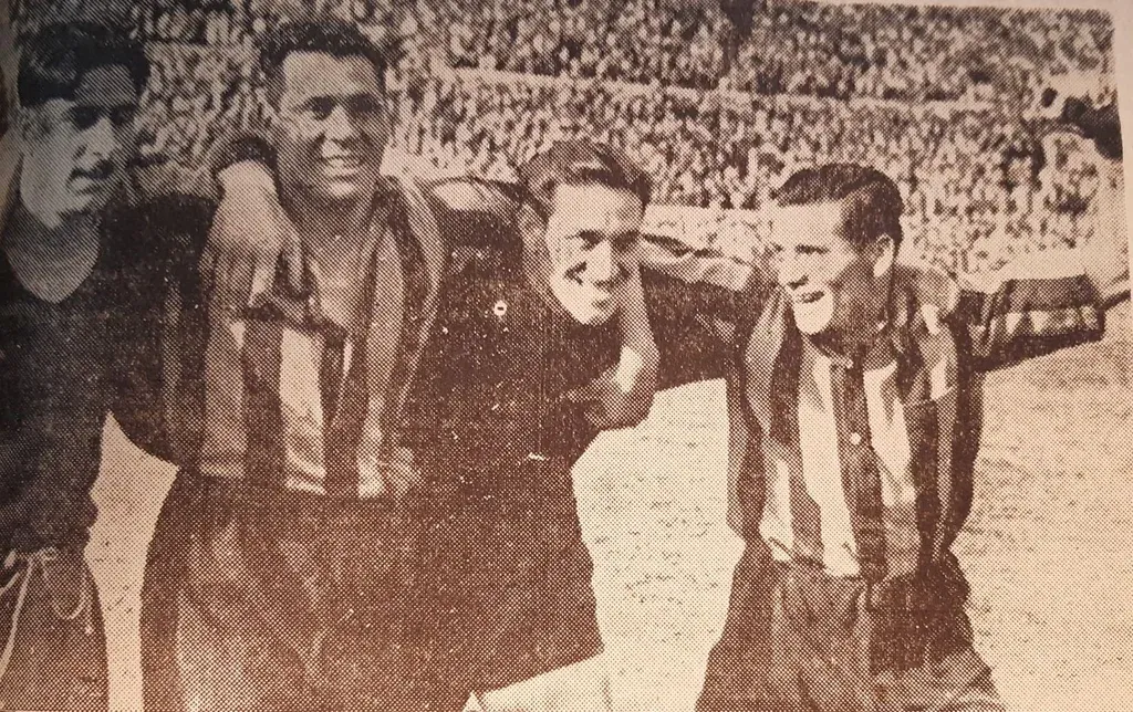 El arquero suplente Dimitrio, Obdulio Varela, el golero Flavio Pereyra Nattero y Enrique Hugo, celebran el título