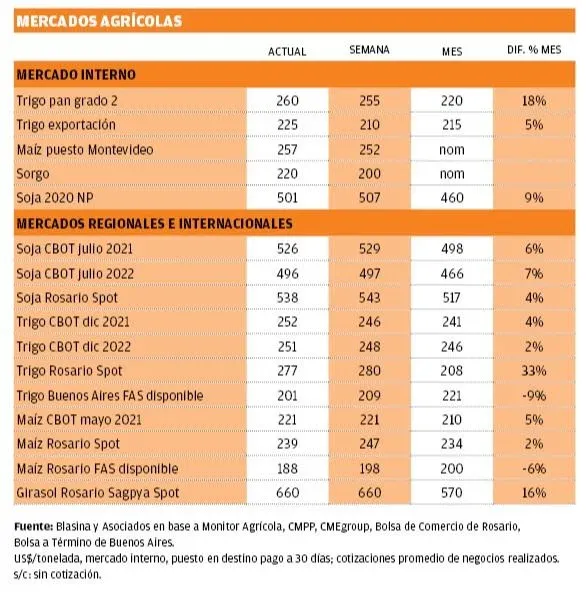 En lo que refiere al mercado de cereales, el panorama es estable y firme. El trigo se mantiene desde hace varias semanas entre US$ 220 y US$ 250 por tonelada, pero por partidas de calidad la Cámara Mercantil de Productos del País (CMPP) ubica precios de hasta US$ 280.