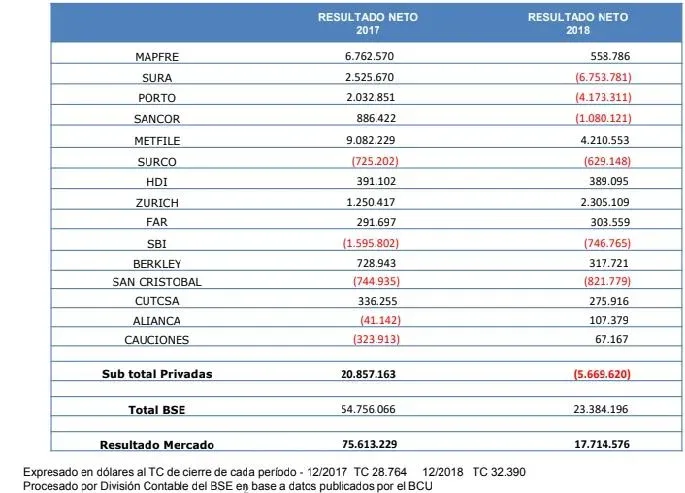 De acuerdo a un relevamiento que divulgó la división contable del BSE en base a los datos publicados por el Banco Central del Uruguay (BCU), el conjunto de las 15 compañías privadas del mercado cerró con un perjuicio de US$ 5,6 millones en 2018, una desmejora notoria frente a los US$ 20,8 millones de ganancia del ejercicio anterior. SURA lideró las pérdidas con US$ 6,7 millones, seguido por Porto con US$ 4,1 millones, Sancor US$ 1,1 millones, San Cristóbal, US$ 821 mil, SBI US$ 746 mil y Surco US$ 629 mil. Dentro de las que cerraron con números positivos, aunque con una fuerte contracción respecto al ejercicio anterior, sobresalieron Metlife con US$ 4,2 millones, Zurich US$ 2,3 millones y Mapfre US$ 559 mil.