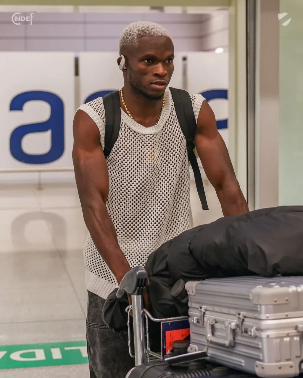 En su llegada al Aeropuerto de Carrasco, el delantero vistió una remera sin mangas y con un tejido tipo malla, además de una cadena dorada y su pelo teñido de blanco.