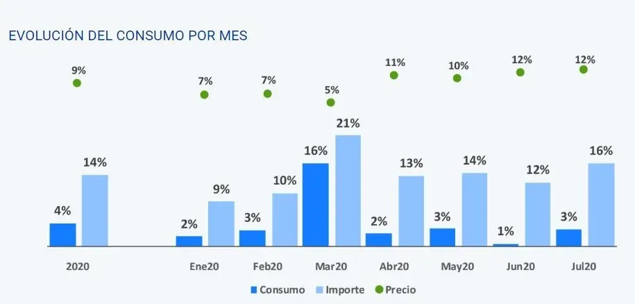 En el acumulado enero- julio se observa un 4% de crecimiento en consumo, de 14% en facturación y de 9% en precio.