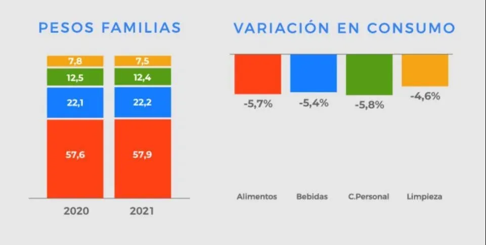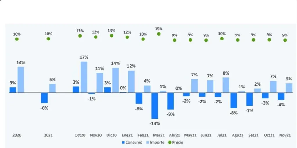 La caída en noviembre 2021 es de 4% respecto al mismo mes del año anterior, con variaciones negativas en todas las familias de productos.