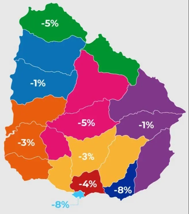 Las variaciones por zona muestran caídas importantes en Maldonado (-8%) y Montevideo (-8%).