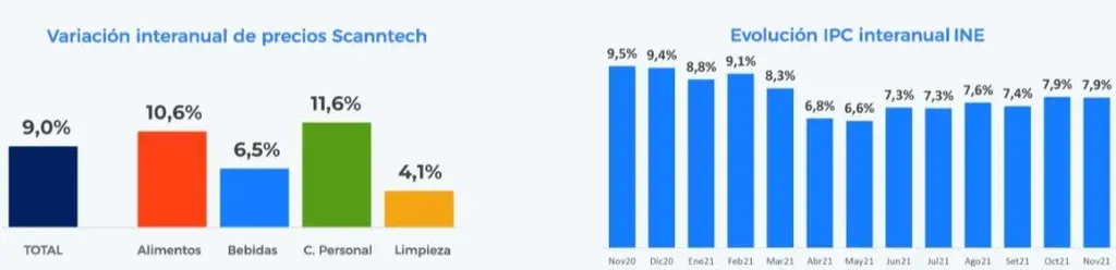 Scanntech destaca que mientras que el aumento de precio promedio desde noviembre de 2020 fue, en el conjunto de los productos, de 9%, el Índice de Precios del Consumo (IPC) lo hizo 7,9%.