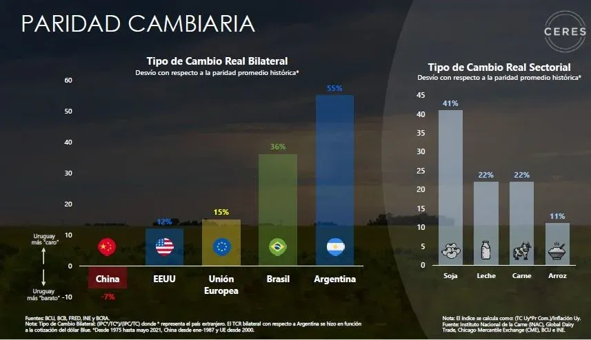 En otra parte de su presentación, el director de Ceres reiteró que Uruguay “está todavía caro” a nivel global. Comparado con el dólar, el peso uruguayo está 12% arriba de la paridad promedio histórica. La disparidad cambiara es más marcada con Argentina que atraviesa una crisis y con Brasil. El analista explicó que hoy una parte del sector exportador tiene “un alivio” en la suba de los precios internacionales, pero el resto “está en un problema de competitividad” y se necesita “dar apoyo” para que se concrete inversión en esos otros sectores.
