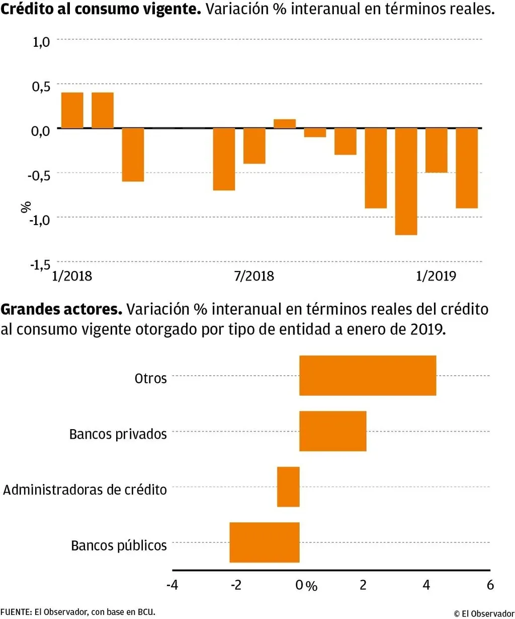 La caída del crédito al consumo se concentró principalmente en el stock del Banco República. La caída fue de 2,2% en febrero respecto a igual mes del año pasado.