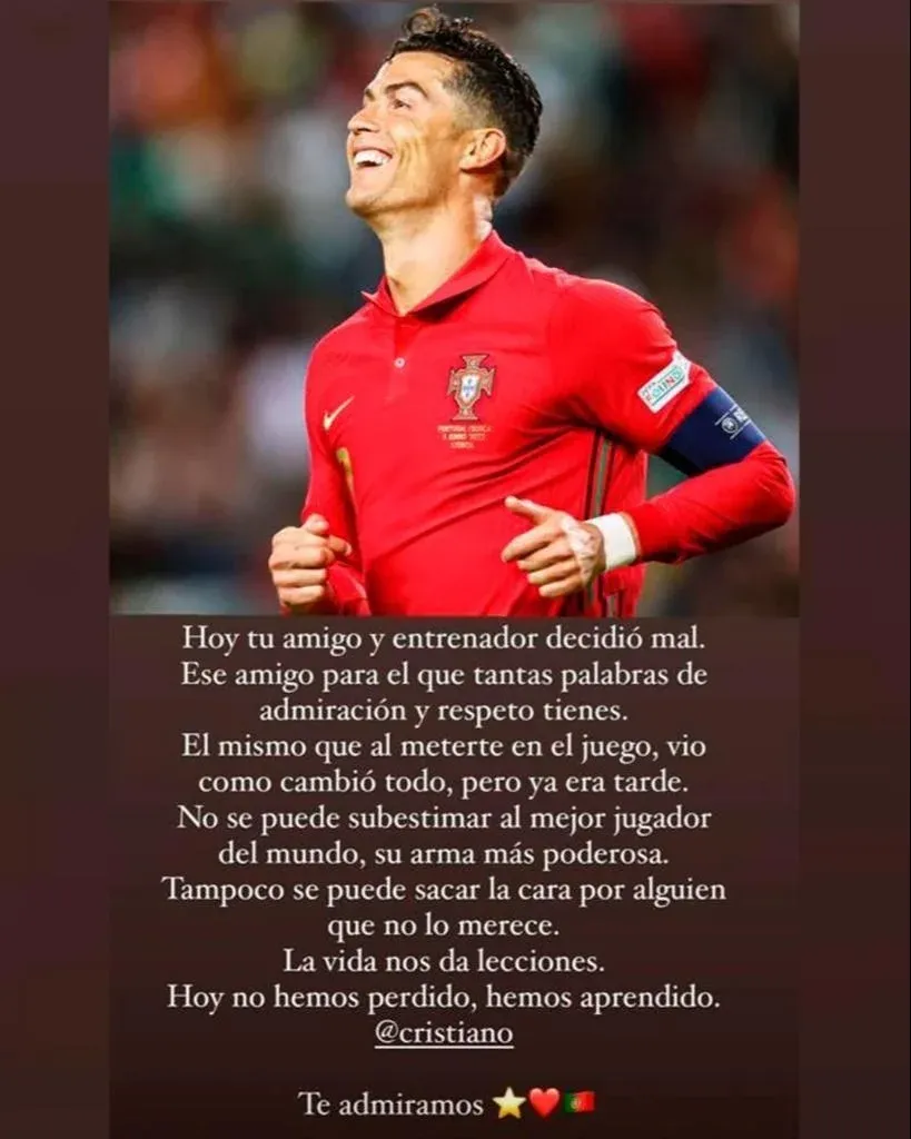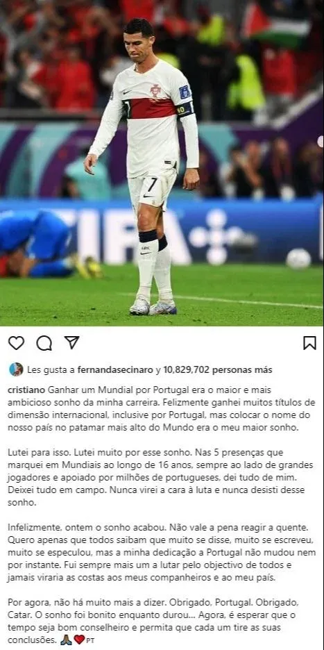 El delantero portugués Cristiano Ronaldo publicó en su cuenta de Instagram (@cristiano) un mensaje tras la dolorosa eliminación que sufrió su selección a manos de Marruecos en los cuartos de final del Mundial de Qatar 2022.