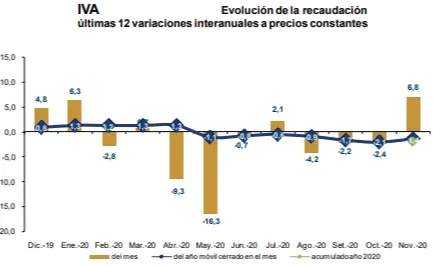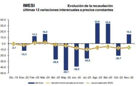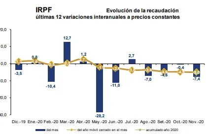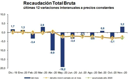 La recaudación total bruta viene mostrando tanto variaciones interanuales positivas como negativas en el período diciembre 2019-noviembre 2020. En el acumulado de los últimos 12 meses la variación interanual fue de -2,8%, según el informe mensual del organismo.