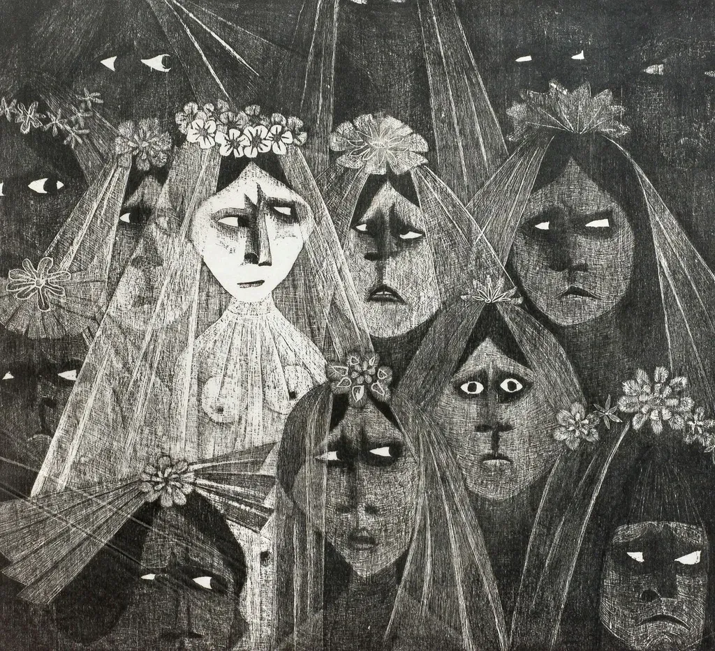 “Novias revolucionarias I”- Leonilda González (1923-2017).Xilografía. Alto: 56 Ancho: 62 cm