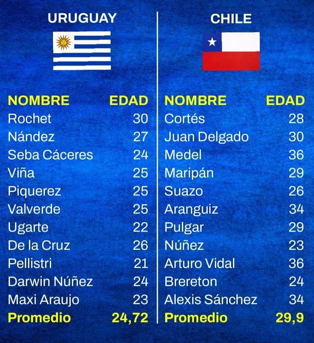 3) Chile llega a Montevideo con un equipo con mucho oficio, 29,9 años de promedio en su equipo titular, un elemento que, bien manejado en este tipo de partidos, puede ser un problema para su rival; aquí están los números: