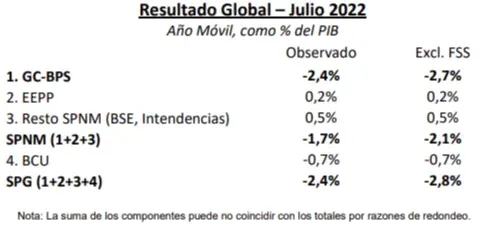En el año móvil a julio, el resultado del Gobierno Central-Banco de Previsión Social (GC-BPS) se ubicó en -2,4% del PIB. Dicha estimación presenta una mejora de 0,2% del PIB respecto a junio de este año. El ingreso de fondos al Fideicomiso de la Seguridad Social (FSS) —ley de los cincuentones— fue de 0,3% del PIB, por lo que el resultado fiscal del GC-BPS excluyendo los ingresos al FSS se ubicó en -2,7% del PIB, según el comunicado del Ministerio de Economía y Finanzas (MEF).