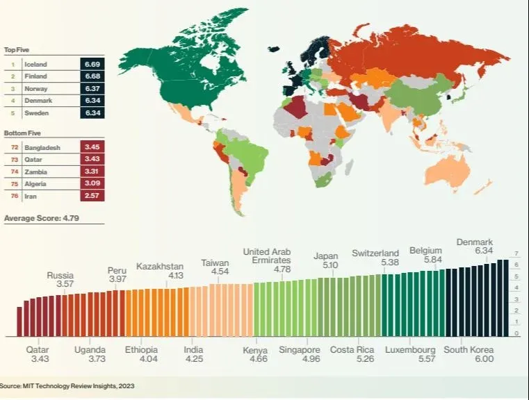 Las cinco primeras economías del mundo que presentaron una mejor realidad en cuanto a su sostenibilidad de cara al futuro las nórdicas de Islandia (6,69), Finlandia (6,68), Noruega (6,37), Dinamarca y Suecia (ambos con 6,34).