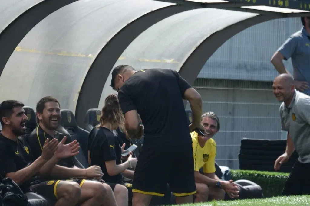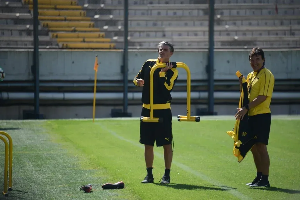 Diego López ayudó al profesor Alejandro Valenzuela a llevar los distintos aparatos para que los futbolistas pudieran moverse en el medio de la cancha del Campeón del Siglo, lo que también provocó la hilaridad del preparador físico mirasol.
