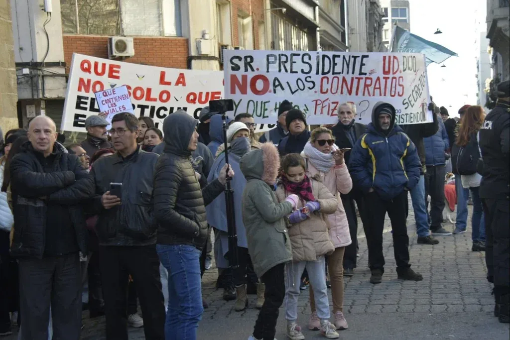 En la misma línea que el reciente fallo del juez Alejandro Recarey, que suspendió la vacunación contra el covid para menores de 13 años, los manifestantes llevaron carteles que hacían alusión al reclamo por conocer de qué están compuestas las vacunas y otros que presentaban frases como "Los niños son nuestro futuro, no tu experimento".