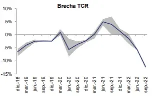 En el escenario base que consideró el IPOM, el TCR comenzaría a depreciarse (el dólar debería subir) a partir del primer trimestre de 2023 y continuaría por ese proceso durante el resto del horizonte de política monetaria (24 meses).