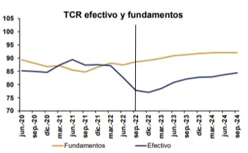 Por otro lado, el TCR de fundamentos estimado por los servicios técnicos del BCU bajó 1,3% en el tercer trimestre como resultado de un deterioro de los términos de intercambio y de la productividad relativa. Así, la brecha entre el TCRE y la del TCR de fundamentos se ubicó 12% por debajo para el promedio de las estimaciones.