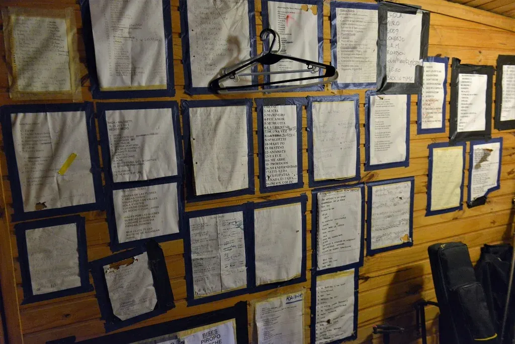 Quiroga se sube al escenario, abre una puerta negra y con el clic del interruptor de luz descubre un cuarto empapelado con listas de repertorios. Lo escanea y enumera al azar: Pedro Aznar, Skay Beilinson, Los Shakers, Rubén Rada, Chico César, David Lebón, Paulinho Moska, Daniel Viglietti, Fernando Cabrera, María Gadú. Son las listas originales del repertorio de quienes tocaron en Medio y Medio. “Los descolgamos así, rotos, pisados, como estén”, dice. Y todavía le queda una montaña guardada por pegar.