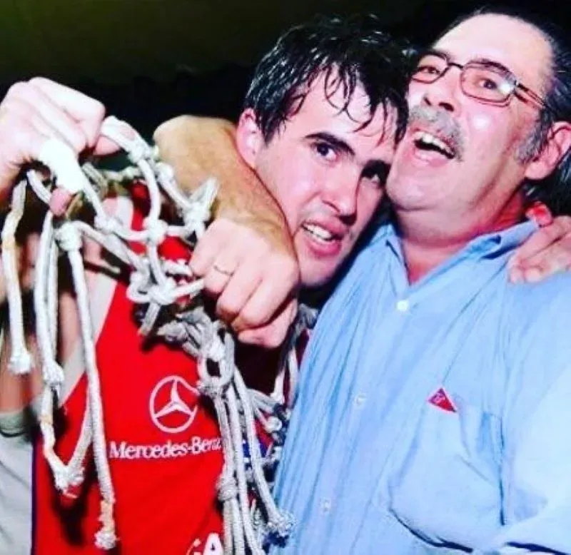 Joaquín Izuibejeres celebrando el título de la Liga Uruguaya de Básquetbol con Trouville en 2005, junto a su padre, el Chino Roberto Izuibejeres; Joaquín es sobrino y ahijado de Eduardo De la Peña