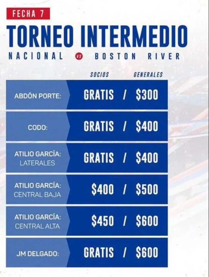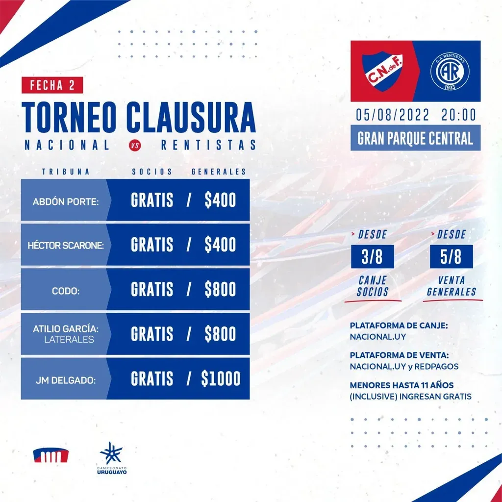 Nacional puso a la venta las entradas para el partido del viernes ante Rentistas a la hora 20 en el Gran Parque Central por la segunda fecha del Torneo Clausura, y anunció un aumento que va desde 33% y hasta 100% para público general en algunos sectores del estadio tricolor.