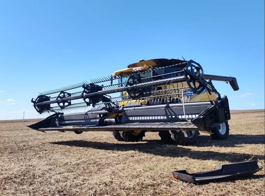La New Holland CR 9080, de lona Mac Don con 40 pies de ancho y uno de los cabezales de cosecha.