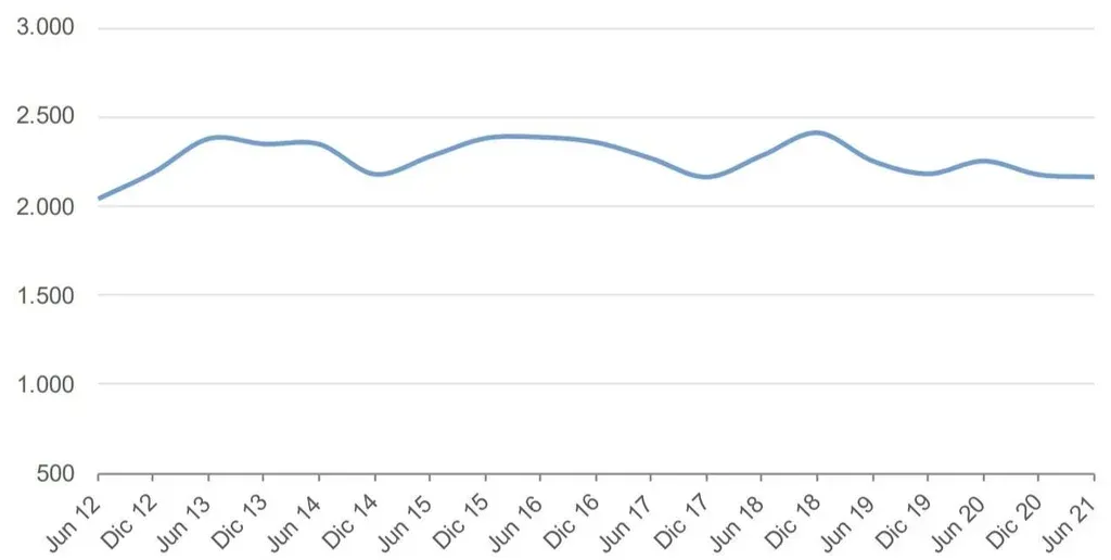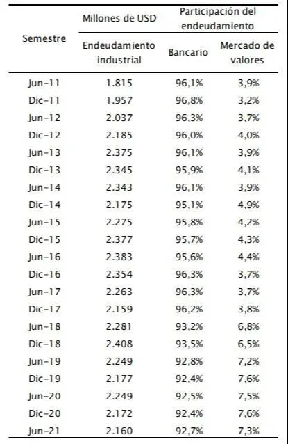 En junio de 2021, el endeudamiento del sector manufacturero se mantuvo relativamente estable respecto a diciembre de 2020. En comparación con junio de 2020, el endeudamiento cayó 4%, ya que los pasivos con el sistema bancario se redujeron US$ 79 millones, mientras que el correspondiente al mercado de valores registró un descenso del 6%.