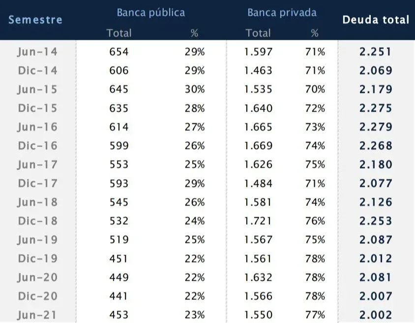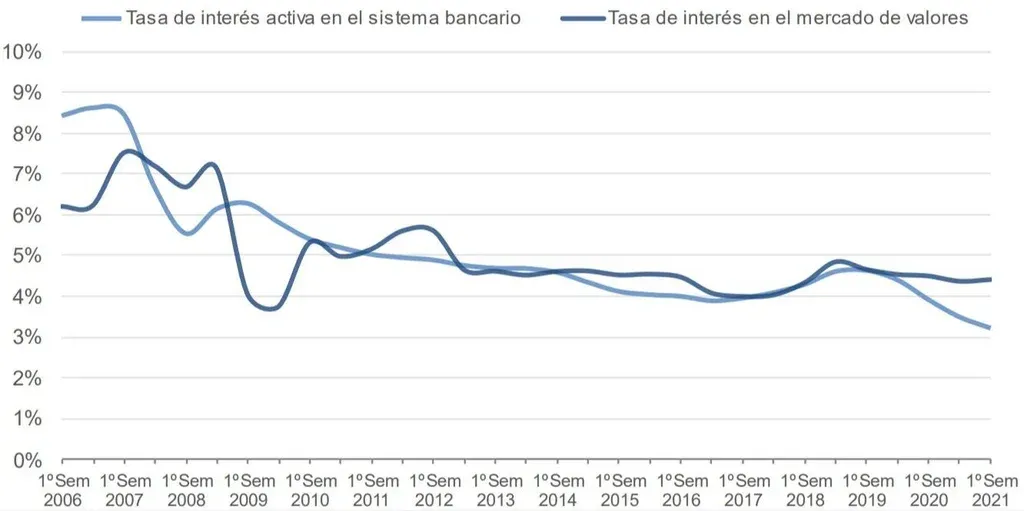 En el primer semestre de 2021, la tasa de interés en dólares promedio cobrada por las instituciones bancarias se ubicó en 3,2%, mientras que la tasa en dólares promedio que se pagó por el endeudamiento a través del mercado de valores se situó en 4,4%.