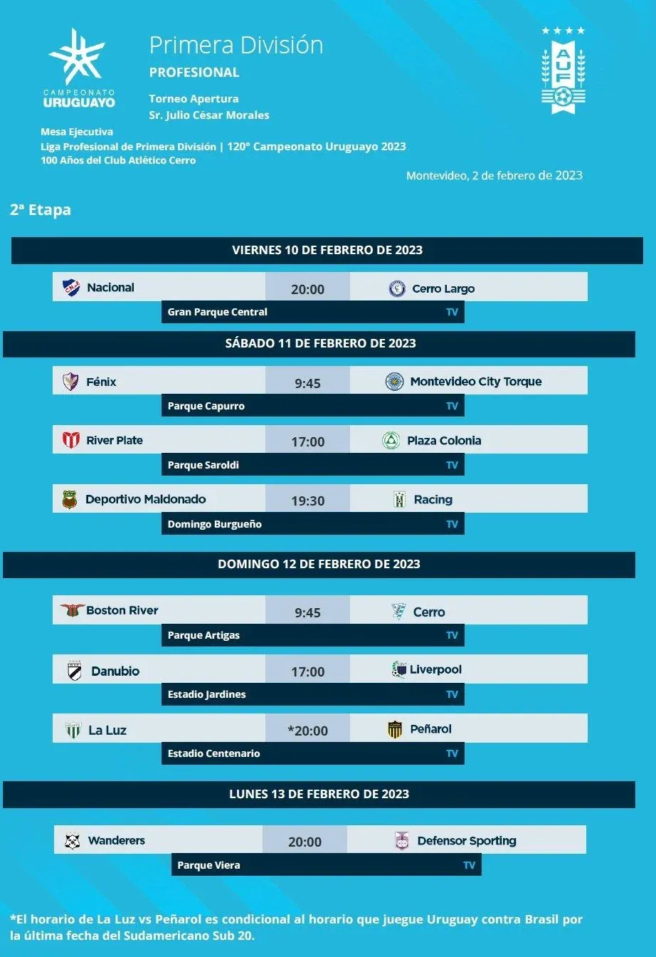 La Mesa Ejecutiva de Primera división de la Asociación Uruguaya de Fútbol (AUF) tiene definidos los detalles de la disputa de la segunda fecha del Torneo Apertura desde el pasado 2 de febrero.