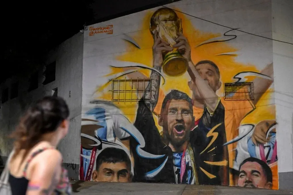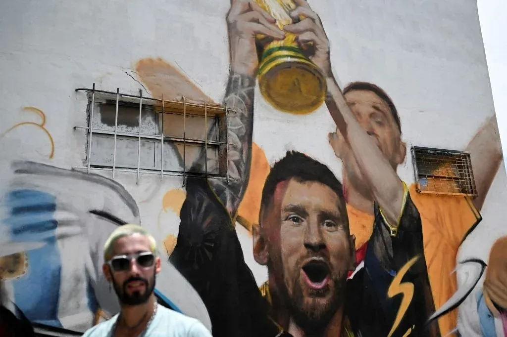 La imagen de Lionel Messi en el momento en que levanta la Copa del Mundo de Qatar 2022, junto a sus compañeros de la albiceleste, se ha convertido en mural en una esquina del barrio de Palermo de la capital argentina, obra del artista callejero Maximiliano Bagnasco.