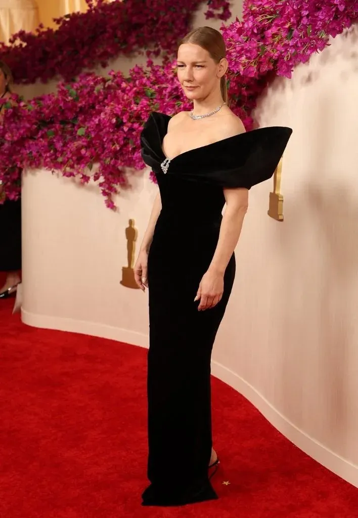 La intérprete alemana Sandra Hueller, nominada a la mejor actriz por Anatomía de una caída y protagonista de Zona de interés, fue preparada para los primeros planos en los Oscar: llevaba un impresionante vestido negro de Schiaparelli con amplio escote escultural.