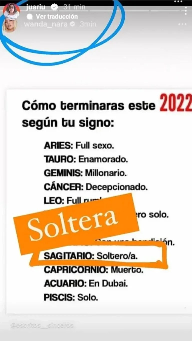 Según una captura que publicó Infobae, el mensaje en cuestión es una placa donde se especifica la situación en la que cada signo del Zodíaco terminará el 2022. En la publicación, la argentina subrayó el concepto vinculado a su signo, sagitario, que era "soltero/a".