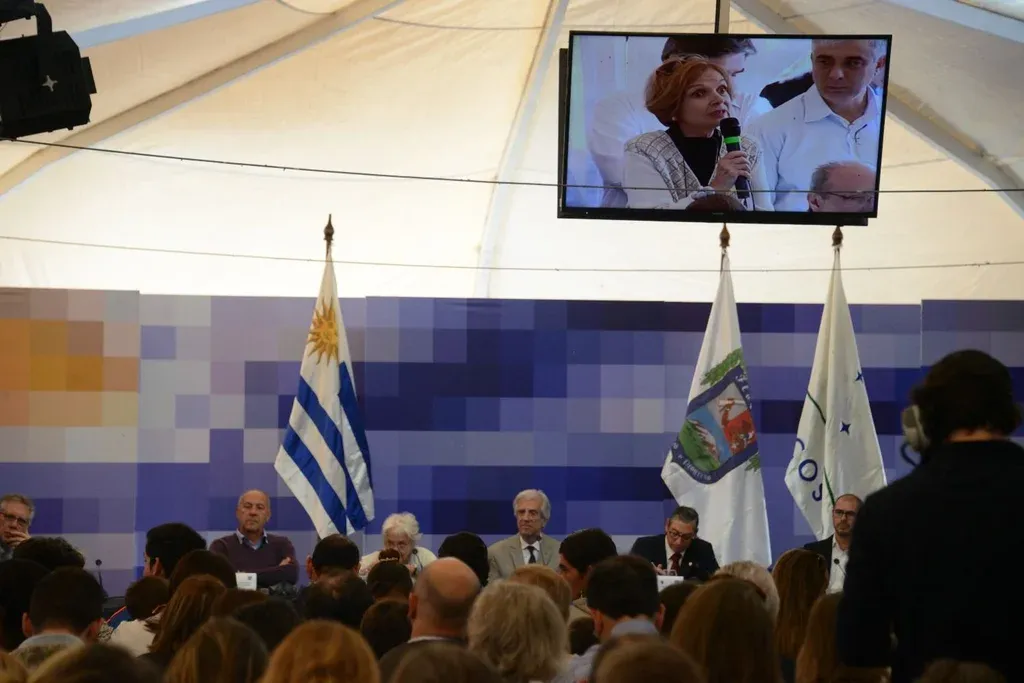Luego de dar cuenta de los asuntos de cada ministerio, el presidente permitió a los vecinos que hicieran las preguntas que quisieran. Juan, un hombre oriundo de Pueblo Centenario fue el primero en hablar. Dijo que hacía 20 años que votaba al Frente Amplio, pero que estaba preocupado por el estado el Río Negro ya que estaba “enfermo” y la “llegada de UPM es matarlo”. El vecino le pidió al gobierno que analice el contrato con la empresa finlandesa y señaló que la localidad necesita puestos de trabajo más estables. Sus palabras fueron aplaudidas por el puñado de militantes de Un Solo Uruguay que estaban afuera escuchando la audiencia y criticando a las autoridades con un megáfono.