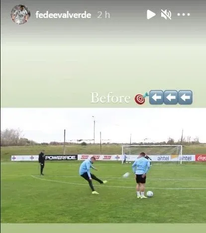 Este lunes, tras la victoria, Valverde compartió una historia en su Instagram con un video de los entrenamientos de tiros libres en el Complejo Celeste, donde, sin barrera, hizo tres goles desde afuera del área.